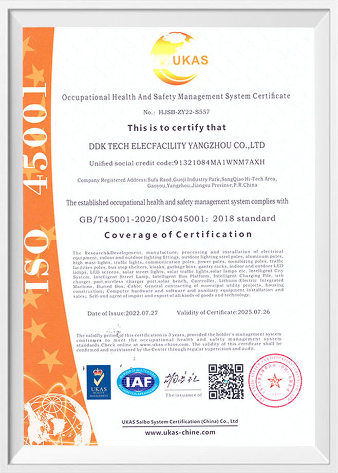 Established in 2018, DDK Tech Elecfacility Yangzhou Co., Ltd. is nestled in the Gaoyou High-Tech Industrial Park of Jiangsu Province, specializing in the manufacturing of outdoor lighting products. Our factory is renowned for producing a diverse range of lighting structures, including lamp poles, traffic poles, surveillance poles, high poles, tower poles, smart street lights, high-pressure sodium lamps, LED street lights, integrated solar lamp poles, solar LED street lights, aluminum alloy garden lamp poles, intelligent solar benches, solar trees, outdoor solar light boxes, and solar bus shelters. Among our innovative offerings are integrated flexible solar lamp poles and flexible solar courtyard lights, catering to the growing demand for flexible solar outdoor lighting solutions.